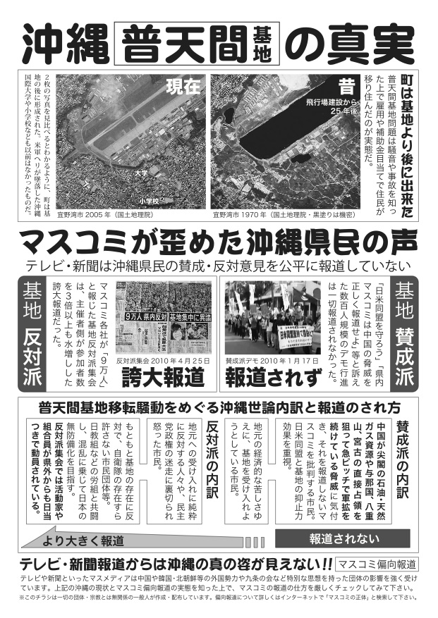 チラシサイトの管理人さんが作ったチラシが普天間基地をめぐるマスコミ偏向報道を鋭く考察されていたので、それに普天間基地の空撮をくっつけてみました。