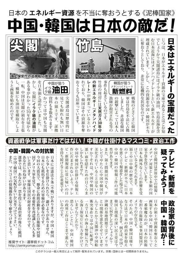 原発事故や震災による停電が深刻な問題になっていますが、尖閣・竹島は領土問題であると共にエネルギー争奪であるということを理解すべきです。